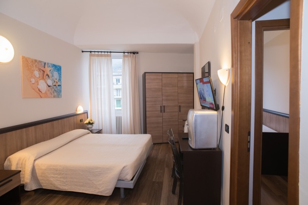 La camera Family dispone di bagno privato con doccia, phon, tv color sat LCD con lettore DVD, telefono diretto, cassaforte, climatizzatore mobile.
